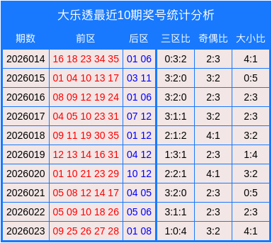 其中前区的三区比为1:0:4,奇偶比为3:2,大小比为4:1。