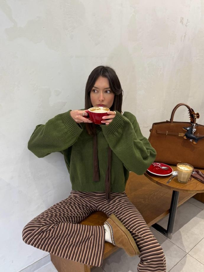 家庭蚁集的年夜饭时辰,Anne的棕绿色穿搭更添关注气味,兼顾恬逸与庆典感。她采用一件浅棕色羊毛诚挚开衫,软糯的材质自带亲和力,内搭乌绿色高领打底衫,浅深交汇的棕绿配色头绪分明,既灭亡了红色的撞款窘态,又让全体造型千里稳又有活力。下装搭配一条棕色灯炷绒半身裙,裙摆的褶皱打算增添灵动性,眼下搭配米色毛绒拖鞋,适配居家团圆的松弛氛围。指尖率领一枚乌绿色玉石适度,与内搭色彩相呼应,耳畔点缀细款棕色皮质耳环,莫得夸张讳饰,却在细节处将春节的喜庆与极简穿搭好意思学圆善和会,每一张家庭合影皆自带关注滤镜。