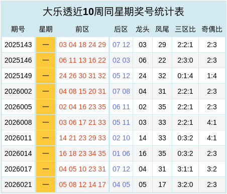 大乐透近十周同星期奖号统计表