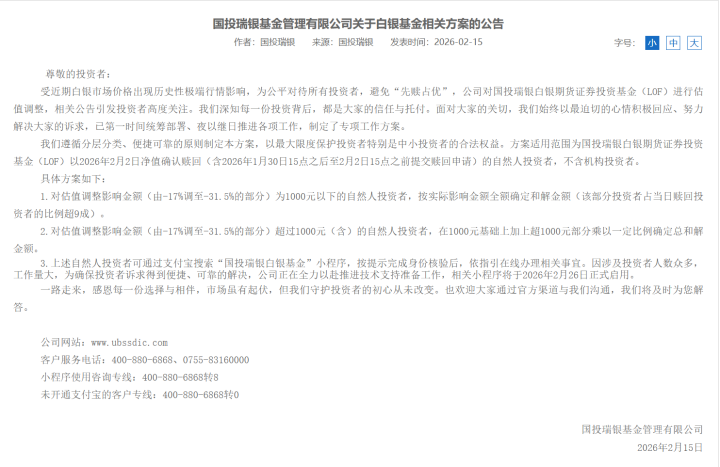 而针对2月2日因估值调理而净值暴跌31.5%的个东谈主投资者,国投瑞银基金也在2月15日发布《对于白银基金关联决策的公告》,示意在1月30日15点之后至2月2日15点之前提交赎回央求的当然东谈主投资者将分层获取相应补偿,资金起原为基金公司的风险准备金。