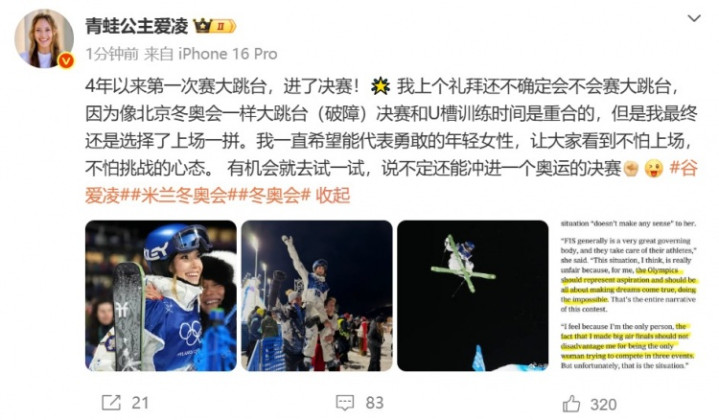 直播吧2月15日讯谷爱凌更新社媒,谈到晋级米兰冬奥会解放式滑雪女子大跳台决赛的感受。