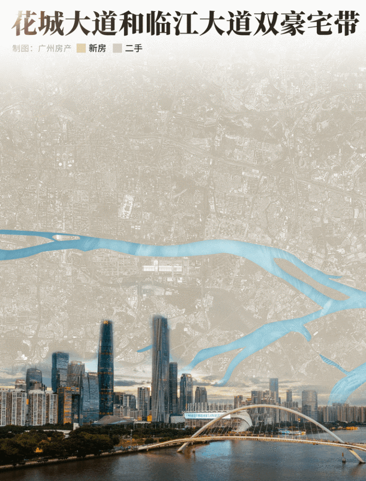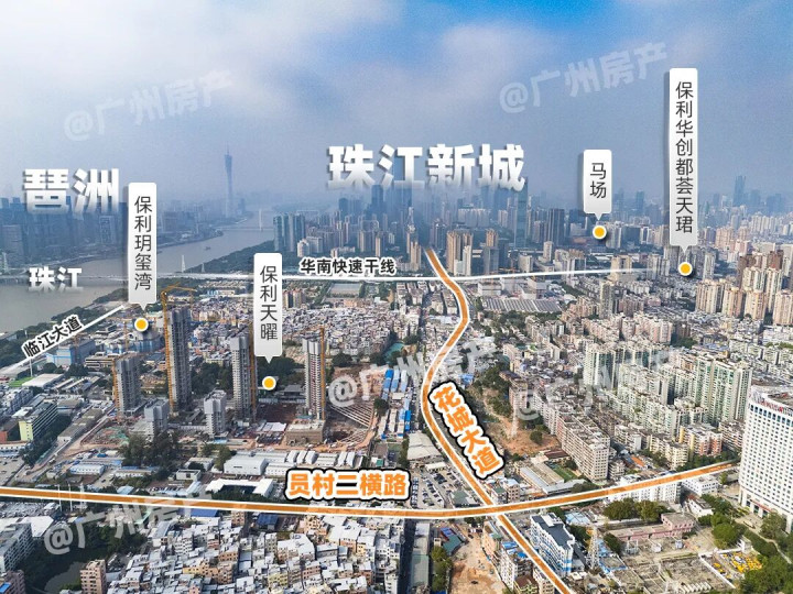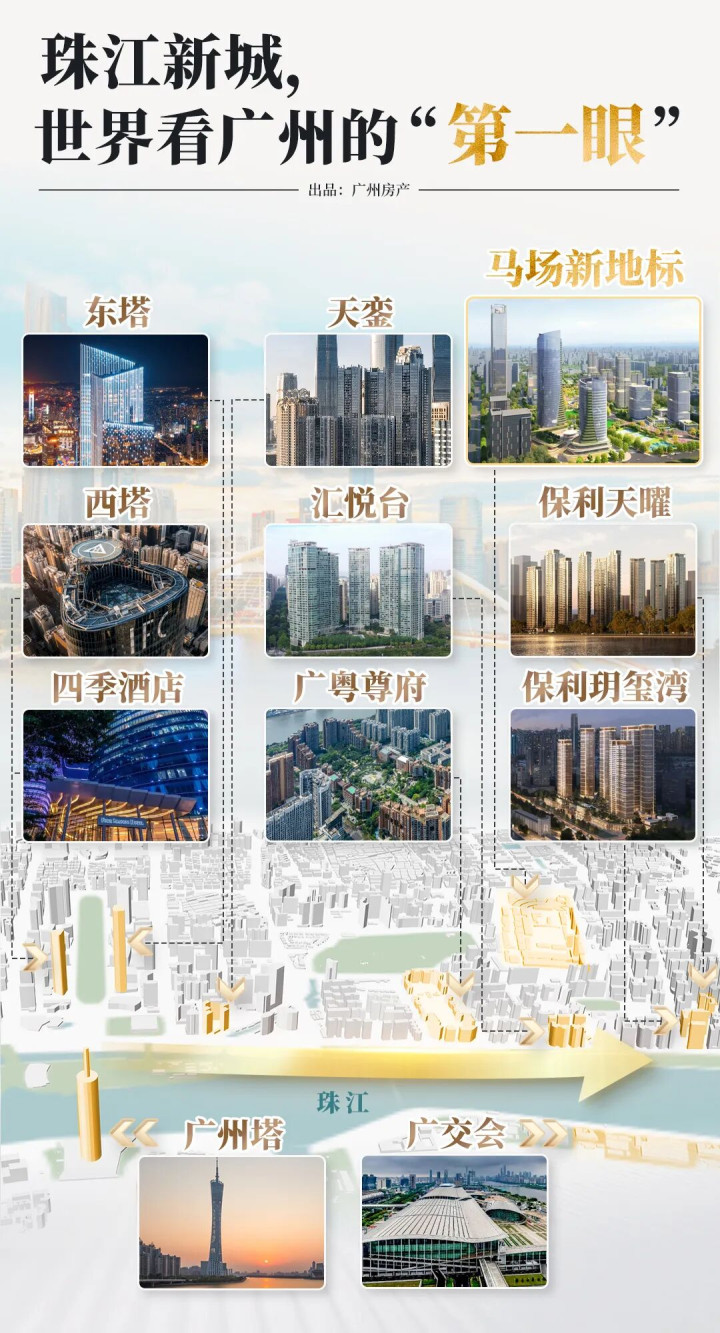 从广州塔、东西塔,到天銮、广粤贵寓、汇悦台,再延迟至保利玥玺湾、保利天曜以及马场新地标共同勾画的珠江新城东段。