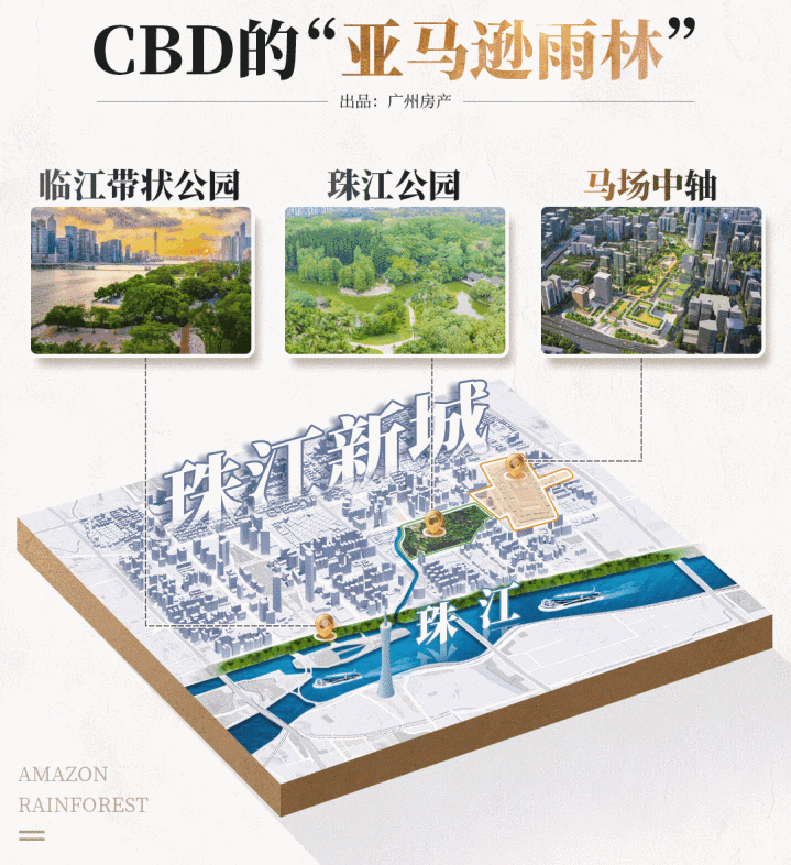 珠江公园的广阔绿意、临江带状公园的生态画卷、直通南北的马场世界顶级公园——三大生态引擎,在城市腹黑交织,编织出一派举世忽视的CBD绿洲。