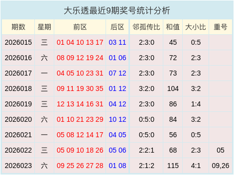 上期开奖数据中得知邻孤传比为2:1:2,大小比为4:1,开出2枚重号09,26,和值数据为115。