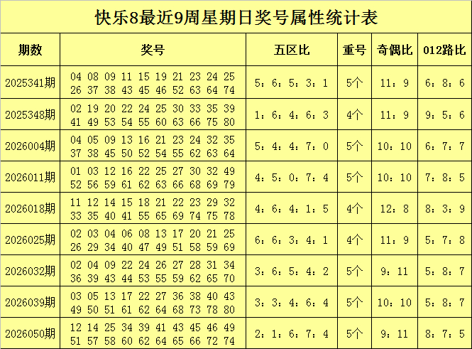 福彩空闲8第2026050期(上周日)奖号总结:12 14 25 34 39 41 43 45 46 49 51 57 58 60 62 64 65 66 72 74,其中奖号奇偶比为9:11,五区比为2:1:6:7:4,012路比为8:7:5,包含5个重号43、49、51、62、64。